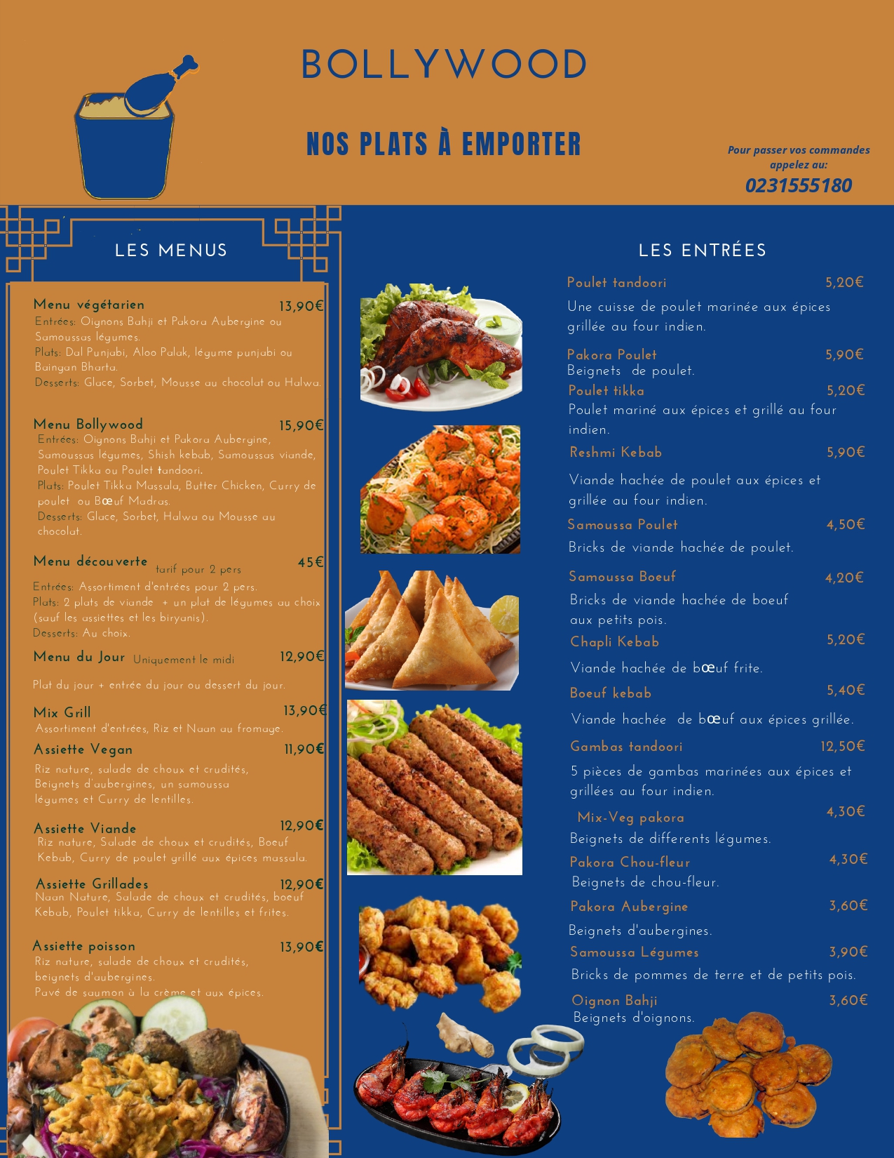 Des plats, des entrées et des desserts divers et variés vous attendent au Restaurant Bollywood. Découvrez l'intégralité de notre menu à emporter !
